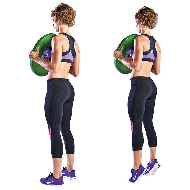How to do it: Stand upright holding the weight plate close to your chest. Position your feet close together with your toes pointing forward. In this position raise your heels on the floor to perform a double leg calf raise. Drop back down and repeat for the required reps.